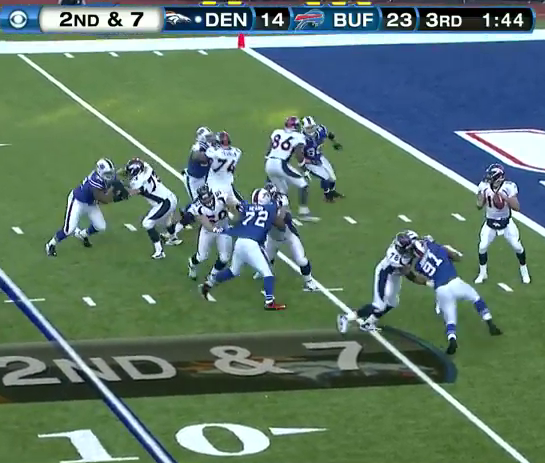 - At 1:44 in the 3rd quarter, Daniel Fells has a nice solo pass block. It is nice to have a tight end that can be counted on to pass block from time to time. You can see him in the pick, below.