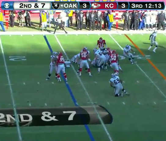- At 8:18 in the 1st quarter, Michael Bush has a nice pass block as he picks up the blitz on the edge. You can see him, below.